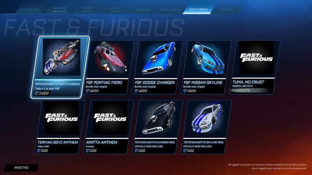 Grazie alla collaborazione con Universal Games e Digital Platforms lo scorso 17 giugno sono approdate sullo store in-game di Rocket League tre auto provenienti dal franchise di Fast & Furious. Per la Dodge Charger e per la Nissan Skyline si tratta di un (gradito) ritorno, mentre per la Pontiac Fiero è un debutto assoluto.