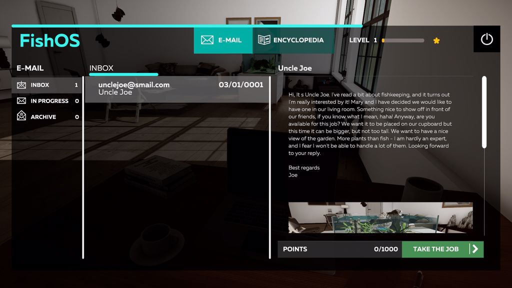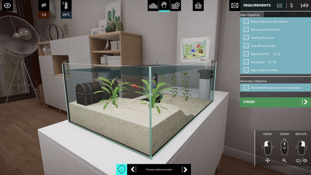 In essa giocheremo nei panni di un vero designer di acquari, che avrà a che fare con una vera clientela e altrettante esigenze più e meno specifiche. Dopo un breve tutorial che ci illustrerà i fondamentali del mestiere, inzieremo a progettare e arredare gli acquari di hotel, uffici, ristoranti e clienti privati, da quelli più “normali” a quelli più facoltosi.