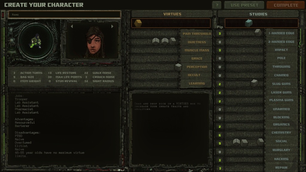 Il background e la creazione non sono però fini a se stesse. Ogni ruolo aggiunto alla scheda del personaggio farà guadagnare sì abilità speciali, ma anche tratti negativi e potenziali debolezze. Ad esempio come soldati potremo soffrire di PTSD (Disturbo da Stress Post Traumatico) e risultare inabili poiché spaventati nel bel mezzo di un combattimento. Un soldato precedentemente disoccupato potrebbe essere poco aggiornato sui prezzi della merce e pagare un malus a tutti i mercanti, e via discorrendo.