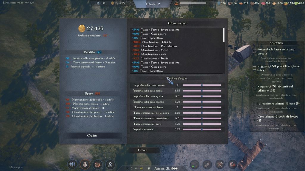 Al momento non ci sono obiettivi specifici da raggiungere nel corso di una partita. Ciò che potremo fare si limita a far espandere a nostro piacimento l’insediamento iniziale, cercando di rendere felici gli abitanti. Infatti dovremo provvedere anche alle loro necessità tramite la costruzione di ostelli, pozzi, taverne ecc. L’elenco degli edifici a disposizione risulta essere fin da subito interessante.