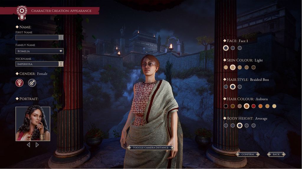 Expeditions: Rome permette ai giocatori di creare il proprio “Legato”, determinandone sia il genere che l’aspetto. Non è però consentito personalizzare nel dettaglio: sarà possibile scegliere esclusivamente tra insieme predefiniti di fisici, volti, capelli e occhi. Tutti elementi legati a degli avatar specifici. Una volta configurato il nostro, lo vedremo comparire nelle miniature durante i dialoghi e in generale nel corso dell’avventura. La scelta tra personaggio maschile o femminile risulterà decisiva, visto che in base al nostro essere uomo o donna i dialoghi, le interazioni e il modo di rapportarsi dei compagni cambieranno di conseguenza.