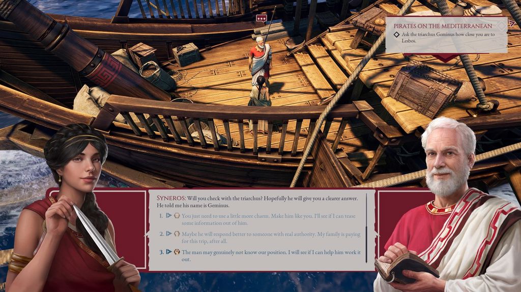 Ben presto scopriremo che la nave su cui siamo imbarcati dovrà partecipare alla storica campagna militare atta a stroncare la ribellione greca nel Ponto, contro lo spietato re Mitridate. Con il tempo, superando una missione dopo l’altra, il nostro protagonista diventerà sempre più importante nel contesto. A supportarci avremo successivamente diverse amicizie, tra le quali merita una menzione speciale il giovane e ancora inesperti Gaio Giulio Cesare.