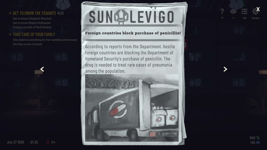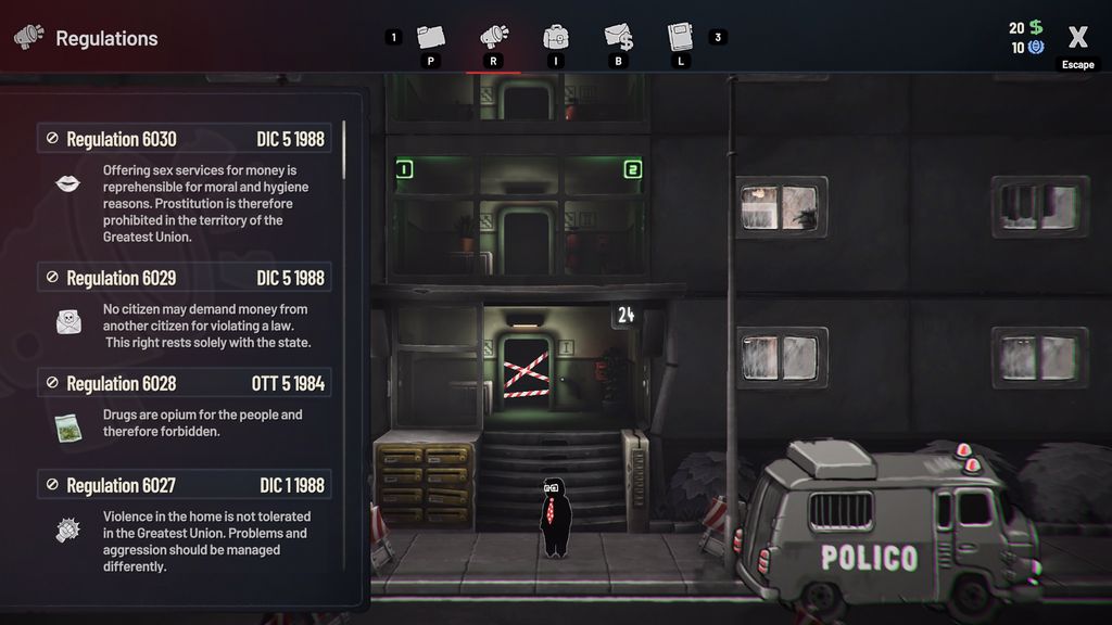 Ma soprattutto, dovremo tenere d’occhio il più possibile gli altri inquilini, monitorando attentamente le loro attività. Questo grazie a strumenti di spionaggio e trucchi di ingegneria sociale. Nel caso in cui dovessimo venire a conoscenza di qualcosa di sospetto, il nostro dovere sarà di segnalare il tutto alle autorità. In termini di scrittura la storia non brilla particolarmente, tuttavia riesce ad effettuare un’ottima ricostruzione della vita all’interno di uno stato totalitario.