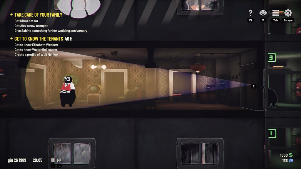 Attenzione però alle multe, che potremo ricevere se ci dimenticheremo di svolgere le normali operazioni di gestione del condominio. O anche se verremo sorpresi a curiosare in giro. Di fatto il titolo di Paintbucket Games ci spingerà in maniera interessante ad adottare, quanto prima, un approccio lungimirante e fortemente volto all’autoconservazione. Per esempio, risparmiare denaro fin dall’inizio della partita ci permetterà di pagare facilmente dell’equipaggiamento di alto livello con certo anticipo. O anche di corrompere del personale per completare più facilmente certe missioni.