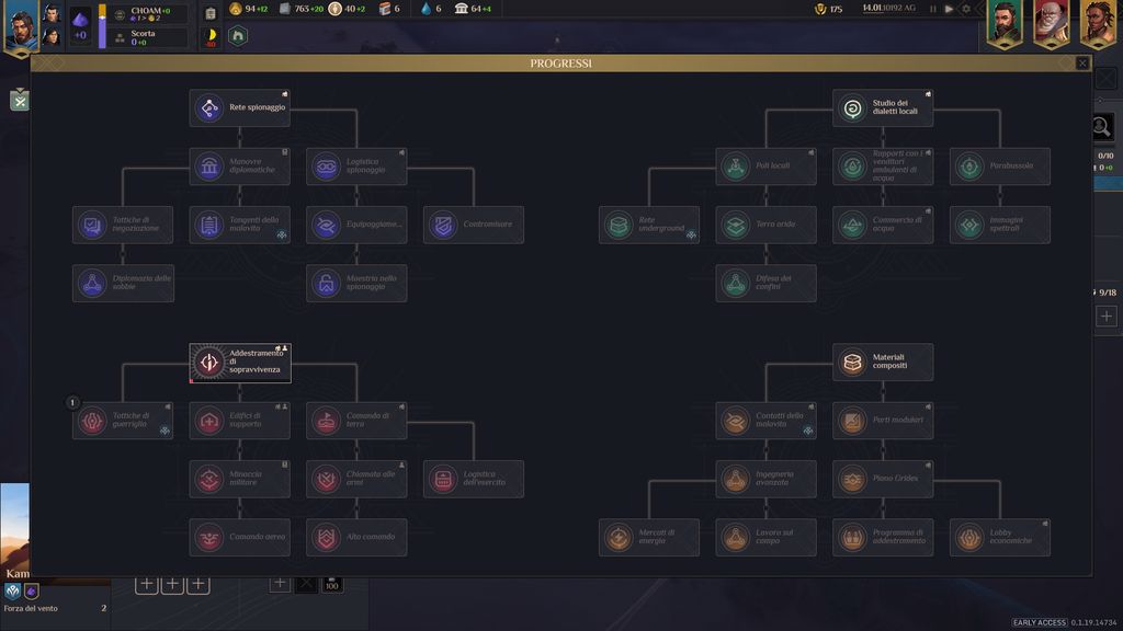 Una mancanza non da poco all’interno di uno strategico di questo tipo. In un certo senso possiamo affermare quanto Shiro Games abbia deciso di puntare maggiormente sull’arte politica e sul commercio. Due pilastri della produzioni che comunque ci metteranno davanti a scelte complesse. Infine, potremo scegliere il tipo di tecnologia su cui investire per la nostra fazione. La scelta iniziale ricadrà su due rami: tattiche di guerriglia e tattiche di negoziazione. Le quali rispecchieranno l’approccio che decideremo di avere in partita, se più cauto o più bellicoso.