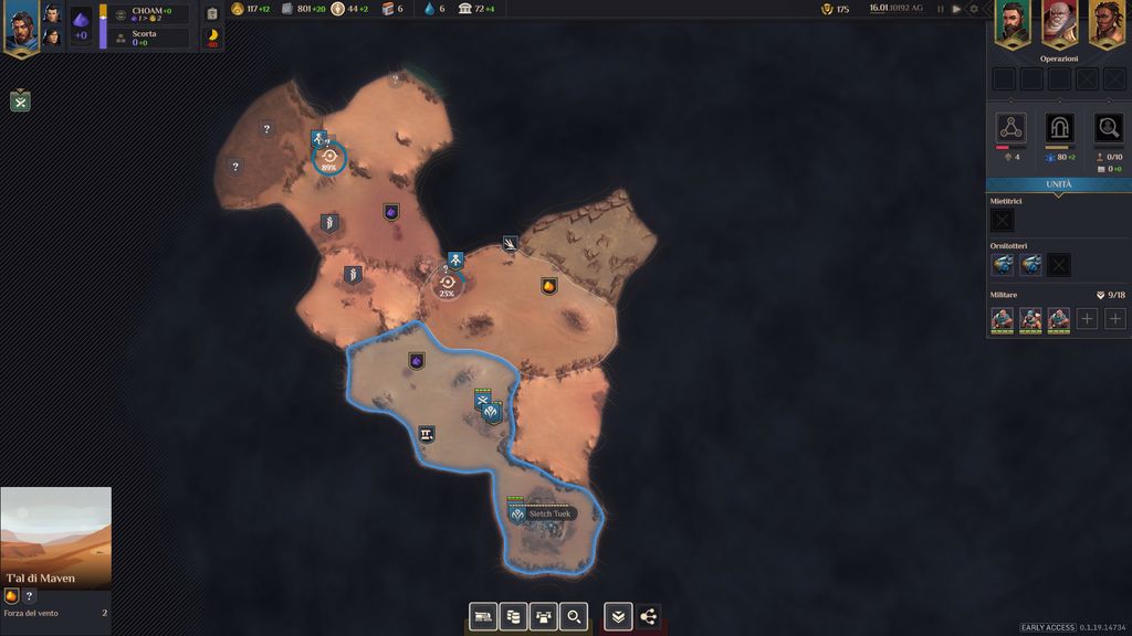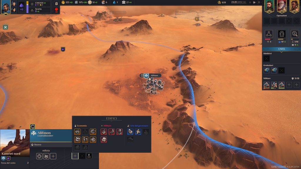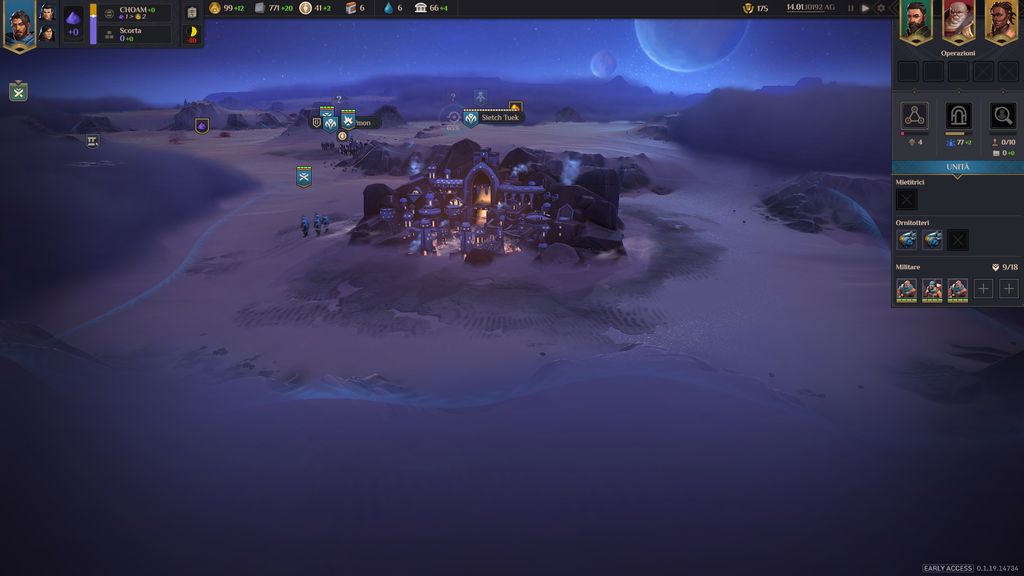 Anche se si trova in accesso anticipato, Dune: Spice Wars ci consentirà da subito di giocare per una delle quattro fazioni presenti sul pianeta deserto di Arrakis. La prima è la fazione di Leto Atreides, che si caratterizza per un’accentuata diplomazia, grazie alla quale può espandere i propri territori annettendo quelli limitrofi in modo pacifico. Un metodo di espansione lento e costoso, ma che consente di non disperdere in maniera eccessiva le proprie forze militari.