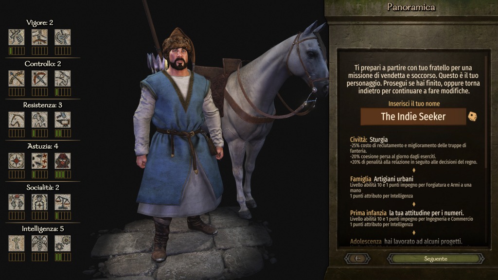 L’editor di Mount & Blade 2: Bannerlord risulta discretamente vario, offrendo ampie possibilità di personalizzazione estetica e ruolistica. Quest’ultimo fattore consta anche di attributi e abilità che si renderanno disponibili a seconda della “genesi” del nostro alter-ego. Un ragazzo partito come contadino difficilmente potrà maneggiare con successo uno spadone a due mani, men che meno parlare come un erudito.