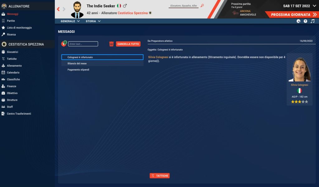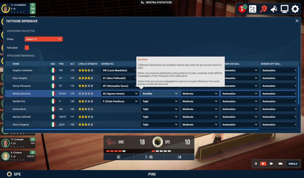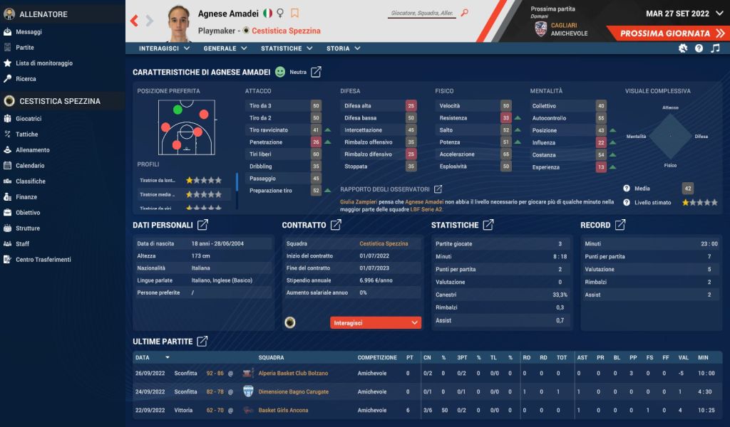 Veniamo quindi a uno degli elementi più importanti di ciascun manageriale che si rispetti: l’interfaccia. Quella di Pro Basketball Manager 2023 è (usando un eufemismo) “ispirata” alla serie Football Manager di Sports Interactive. Sia i menu posti a lato dello schermo che quelli relativi a giocatrici e personale tecnico ricalcano infatti il noto manageriale calcistico. Sebbene a conti fatti la simulazione realizzata da Umix Studios tenda a cercare maggiormente una via di mezzo tra semplificazione e profondità di dati e statistiche.