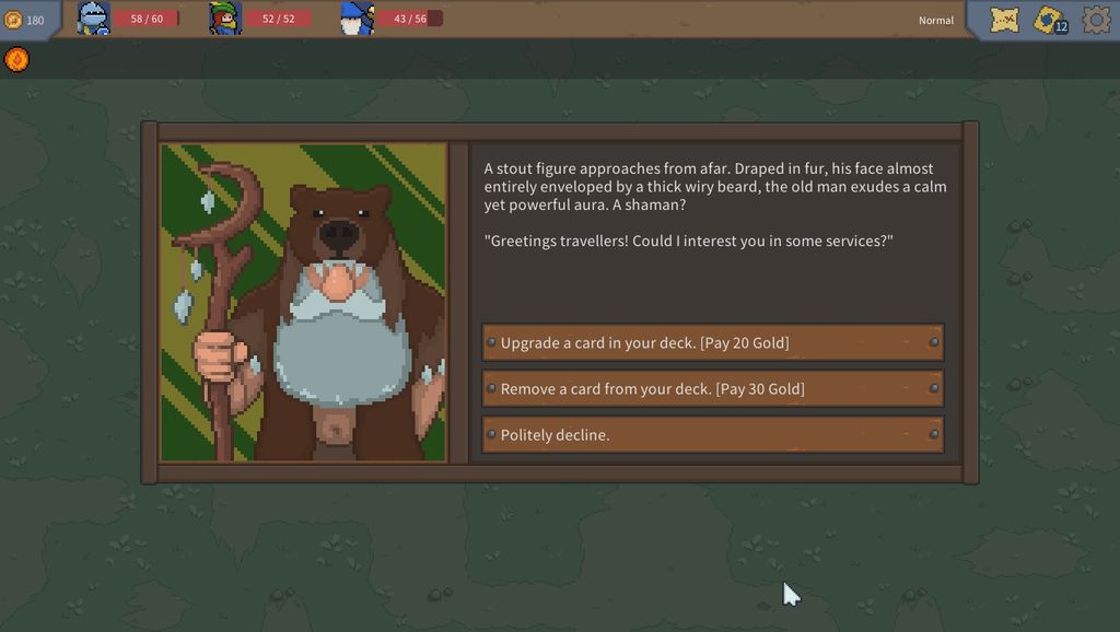 Le diramazioni e la tipologia di incontri che faremo durante la partita saranno casuali, ma comunque riassumibili in tre segmenti. Incontro pacifico con npc per l’acquisto di carte o artefatti in grado di potenziare il party, combattimenti (di cui parleremo più avanti ndr) e infine npc che, dietro pagamento, potranno garantire bonus o la possibilità di non incorrere in malus.