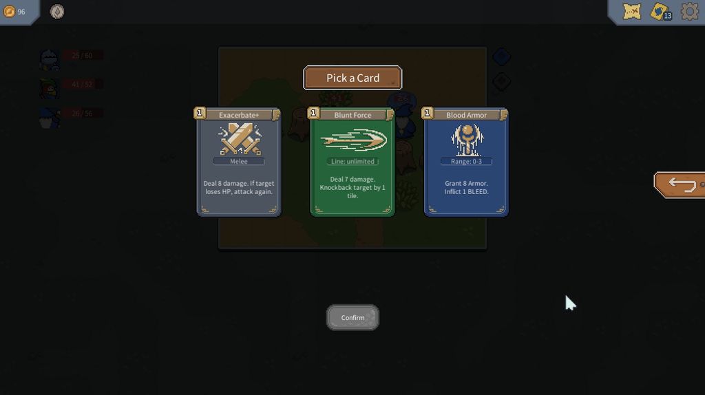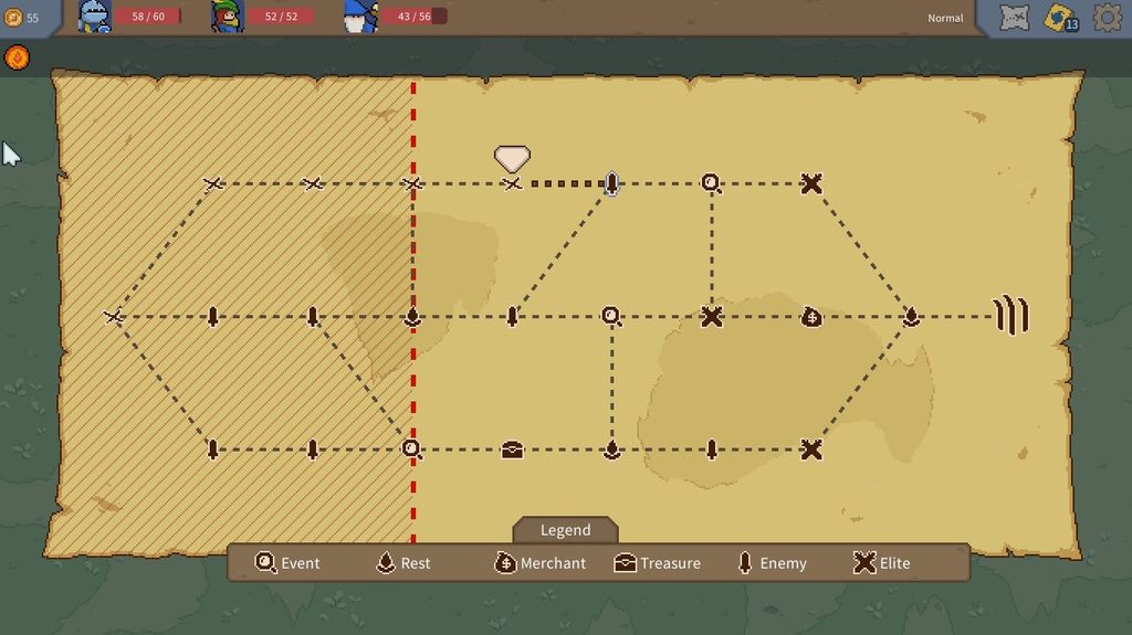 Ogni partita comincerà con la scelta del party, che almeno all’inizio sarà forzatamente composto da un guerriero, un mago e un arciere. Non potremo personalizzarne l’aspetto esteriore, le abilità o qualsivoglia talento poichè la progressione sarà scandita dall’esplorazione della mappa e da ciò che troveremo lungo la strada. Nel corso del gioco il nostro party composto da tre eroi si muoverà lungo uno dei tre sentieri predisposti.