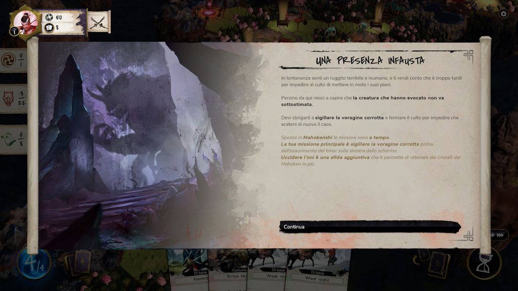 La componente narrativa di Mahokenshi viene da subito adoperata come pretesto per introdurre la doppia struttura ludica alla base della produzione: quella strategica e quella da deckbuilder. La storia di porterà nel più classico folklore giapponese, con demoni e stregoni intenti a mietere vittime corrompendo una terra altrimenti priva di malvagità. Il personaggio che andremo a impersonera diverrà un Mahokenshi, ovvero un samurai legato a una delle divinità (Kami) presenti che avrà il compito di sfidare e sconfiggere la corruzione.