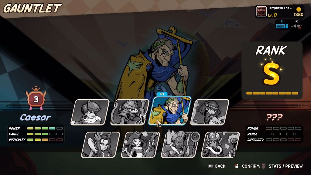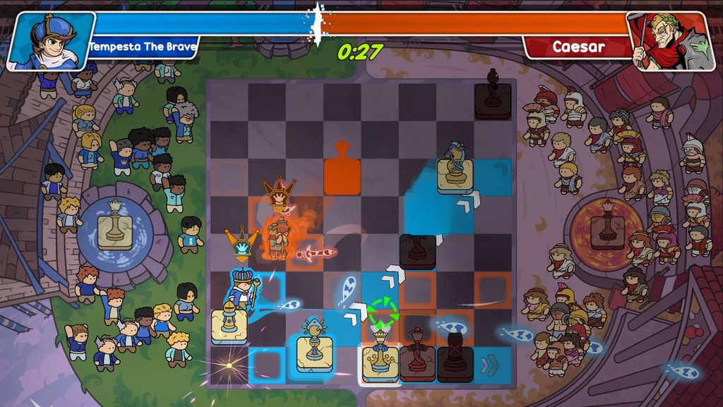 Il titolo offre combattimenti 1v1, da giocare contro l’IA o contro un altro giocatore, sia in locale che online. Una volta selezionato uno degli otto personaggi disponibili (che andranno sbloccati giocando) scenderemo in “campo”, o meglio su una scacchiera vera e propria. La prima cosa che salterà all’occhio è il fatto che non vedremo alcun pezzo, degli scacchi.
