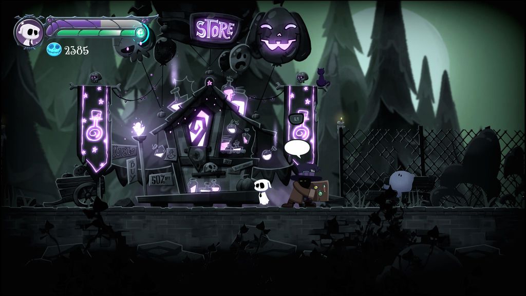 Ciò che colpisce Death or Treat fin dal primo avvio è certamente la sua graziosissima grafica. Il team di Saona Studios ha optato per dei disegni a mano, sempre con tinte dark (giustamente, data l’ambientazione halloweeniana) e con una cura dei dettagli molto raffinata. Sia i fondali che i nemici risultano belli da guardare e anche abbastanza variegati, senza contare il caratteristico protagonista, Scary, che sicuramente conquisterà molti cuori.
