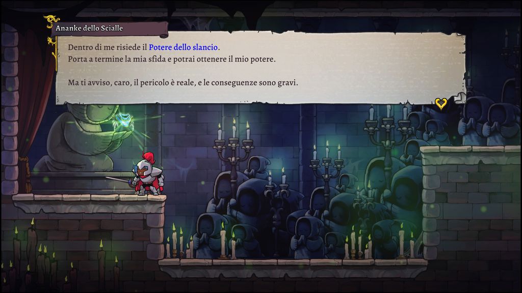 Il problema è che questo attacco risulta piuttosto scomodo, e il timing con cui usarlo rimane avvolto nell’incertezza anche dopo molte ore di gioco. Perciò superare certi ostacoli sarà davvero ostico e potrebbe richiedere più tentativi. Oltretutto sono stati inseriti diversi requisiti per entrare nelle nuove aree, proprio come accade nei migliori metroidvania. E per ottenere la caratteristica che ci permetterà l’ingresso nella nuova zona dovremo superare una prova d’abilità platform.