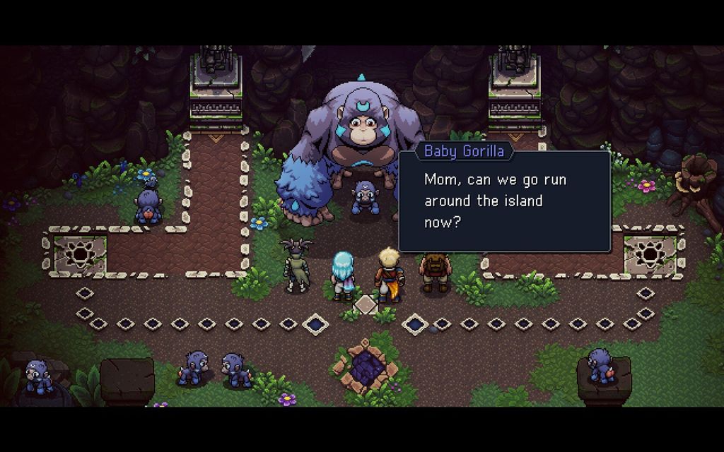 Durante il nostro viaggio (che porterà via più di una trentina d’ore per chi cercherà di completare quanto più possibile) assisteremo ovviamente all’incontro con altri personaggi. Dall’amico d’infanzia Garl al capitano Klee’shäe, fino ad un archivista che fungerà anche da narratore e un’anima solitaria la cui esteriorità ci ha ricordato Solosis. Un cast variopinto purtroppo non approfondito a dovere, che offrirà qualche battuta di spirito e momento di riflessione. Il mondo di Sea of Stars non sarà roseo quanto i pixel di cui è composto.