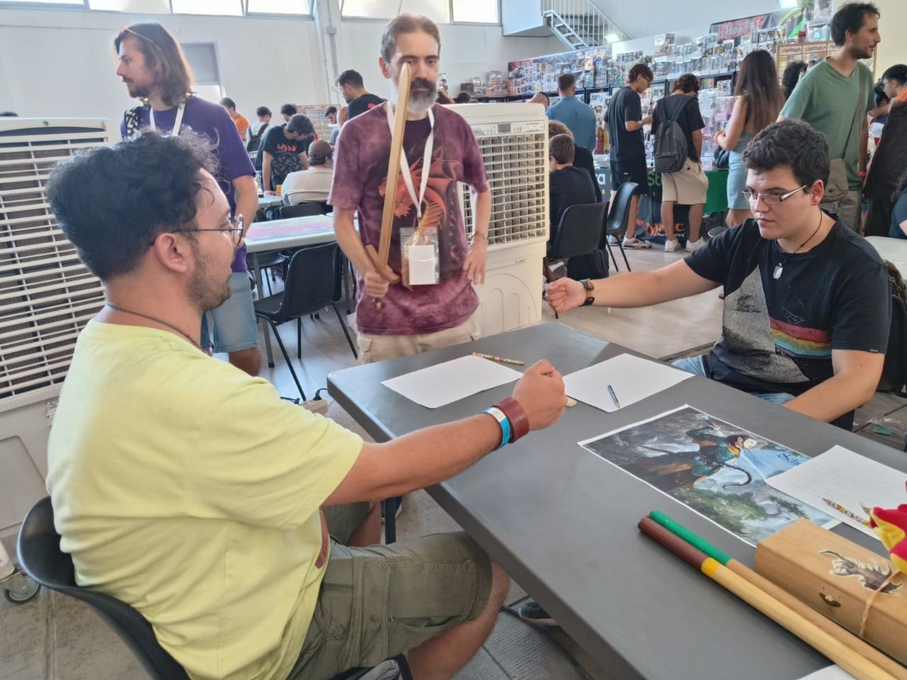 Soddisfatti complessivamente dalla sola sezione eSports, decidiamo di proseguire verso la zona Giochi di Ruolo e Giochi da Tavolo, dove troviamo i tavoli per provare i giochi forniti dal Mondadori Store di Palermo, gestito dai simpaticissimi ragazzi del gruppo Phantasya Project. Ed è qui che abbiamo incontrato l’ospite Fabrizio Corselli, uno dei massimi esperti di epica orale a tema draconico in Europa, intento a divulgare nel pratico l’arte della scherma elfica (da lui stesso creata). Ciò nonostante chiacchieriamo anche con lui, ponendogli qualche domanda: