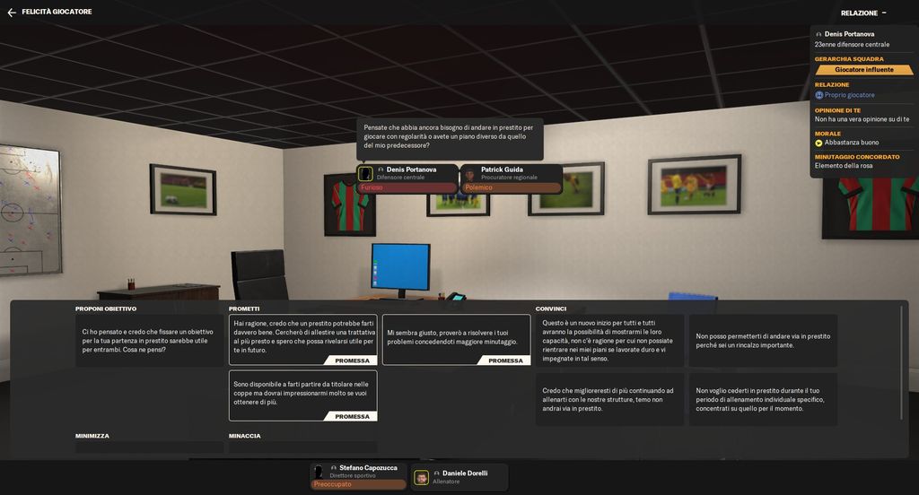 Sarebbe quindi stato opportuno optare lasciare la possibilità di decidere a seconda dell’esperienza desiderata, senza relegare il giocatore al ruolo di spettatore (o quasi). La possibilità di interagire con i calciatori è stata ulteriormente approfondita con l’inserimento degli obiettivi. Potremo cercare di spronare un elemento della rosa infelice o scarso proponendo una sorta di sfida con regalino al seguito.