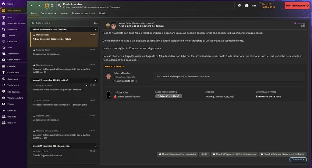 Dopo aver convinto il giocatore che non rientra nei nostri piani ci affideremo a questo agente, che si prodigherà per la sua cessione, possibilmente in tempi brevi. A livello pratico la sua figura risulta utile fino a un certo punto, poiché in più di un’occasione ha ottenuto risultati identici a quelli che conseguito noi offrendo il giocatore a bassissimo prezzo o addirittura a zero. Confidiamo che tali meccaniche verranno rese più efficaci e realistiche con la nuova iterazione che, per l’occasione, offrirà una struttura basata sul discusso engine Unity.