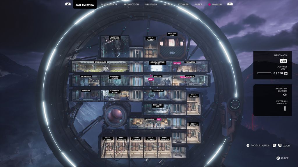 Il gameplay di The Alters si sviluppa in una base mobile cilindrica, nella quale possiamo costruire stanze con funzioni specifiche, dalla produzione di risorse alla gestione dell’energia, passando per laboratori e dormitori. Il tutto va bilanciato con estrema attenzione, perché il tempo scorre (letteralmente), e ogni minuto che passa segna il progressivo avvicinamento del disastro.